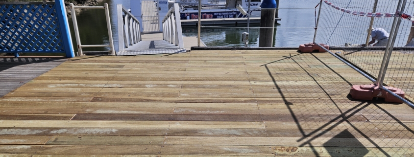 The first stage of the replacement of the main deck is now compete and access to the floating marina via the main ramp is now open. Remember however this is still a building site and will be for some weeks to come so everyone needs to be careful. The deck structure is treated local hardwood and each plank is individually laid.