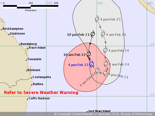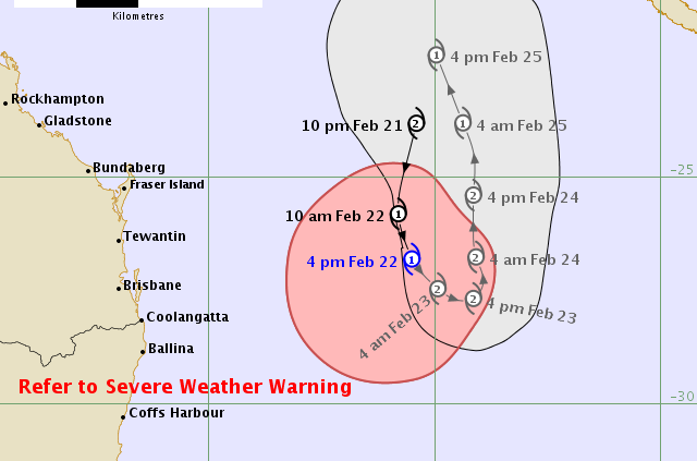The wind from cyclone Oma is quite strong. We’ve had gusts of over 70kmh today. Seas are big and will be for a while. We are keeping an eye on all the boats in the marina and on our moorings. Oma is quite fickle…just look at the BOM track!!!!