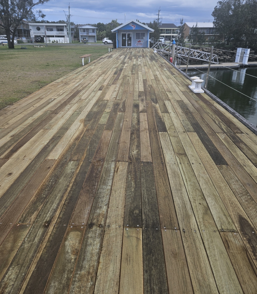 The work on the replacement of the main timber jetty is well underway. For the record more than 1920 lineal metres of hardwood timbers are being replaced and the new boards are secured by more than 4000 Stainless bulge batten screws and glue. All the work is hand-done by Steve Abbott. The local hardwood timbers have been treated to ensure long-life.