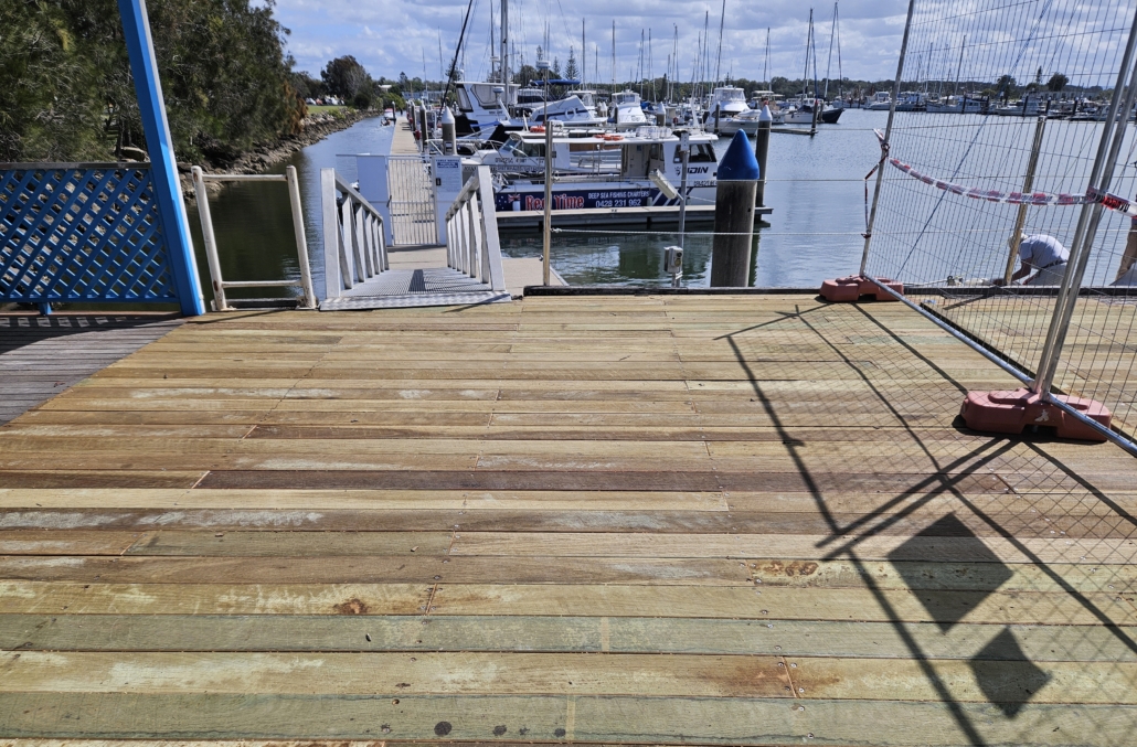 The first stage of the replacement of the main deck is now compete and access to the floating marina via the main ramp is now open. Remember however this is still a building site and will be for some weeks to come so everyone needs to be careful. The deck structure is treated local hardwood and each plank is individually laid.