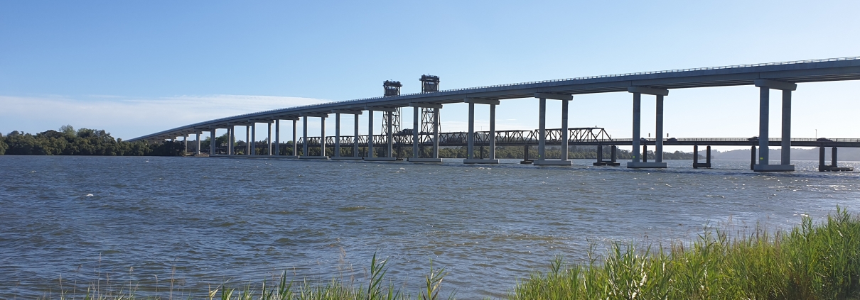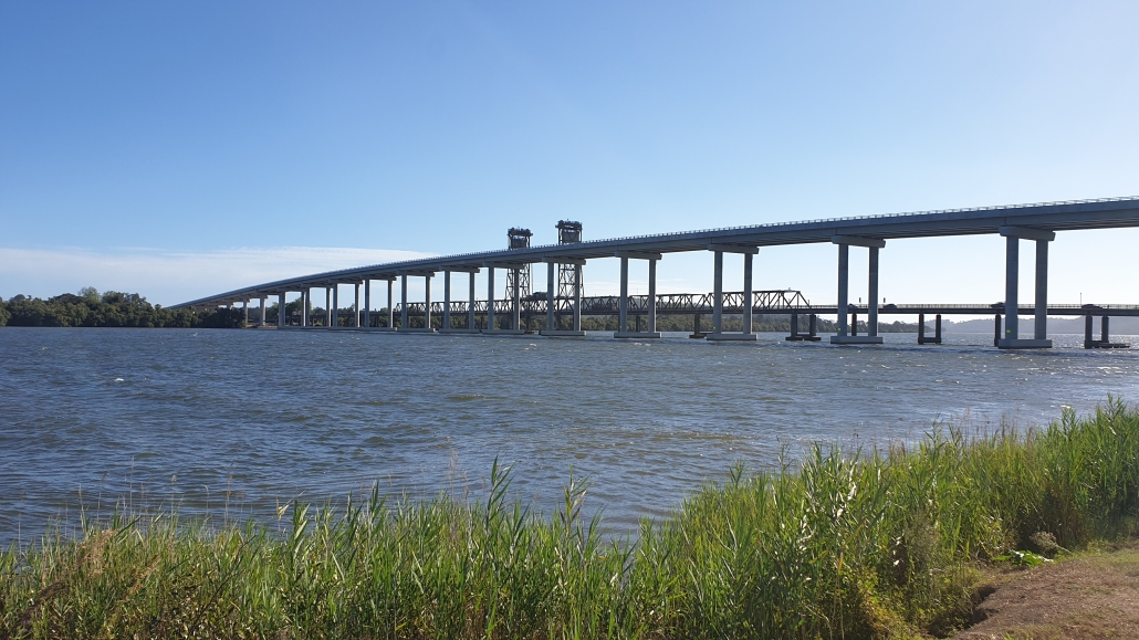 This is looking from the north- eastern side of the new Harwood Bridge…..$1.6 billion of engineering marvel. 30 metre clearance for the biggest masts. Not open to road traffic yet as all the connecting roads etc need to be finished. The second picture is from the north-western side of the bridge….showing the old bridge in the foreground.